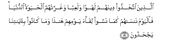 51. Allatheena ittakhathoo deenahum lahwan walaAAiban wagharrat-humu alhayatu alddunya faalyawma nansahum kama nasoo liqaa yawmihim hatha wama kanoo bi-ayatina yajhadoona