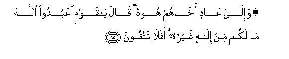 65. Wa-ila AAadin akhahum hoodan qala ya qawmi oAAbudoo Allaha ma lakum min ilahin ghayruhu afala tattaqoona