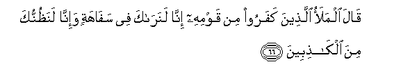 66. Qala almalao allatheena kafaroo min qawmihi inna lanaraka fee safahatin wa-inna lanathunnuka mina alkathibeena