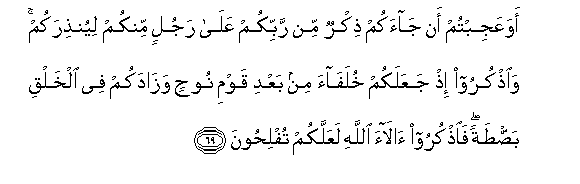 69. Awa AAajibtum an jaakum thikrun min rabbikum AAala rajulin minkum liyunthirakum waothkuroo ith jaAAalakum khulafaa min baAAdi qawmi noohin wazadakum fee alkhalqi bastatan faothkuroo alaa Allahi laAAallakum tuflihoona