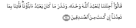 70. They said: "Comest thou to us, that we may worship God alone, and give up the cult of our fathers? bring us what thou threatenest us with, if so be that thou tellest the truth!"