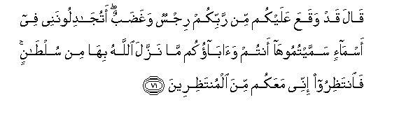 71. Qala qad waqaAAa AAalaykum min rabbikum rijsun waghadabun atujadiloonanee fee asma-in sammaytumooha antum waabaokum ma nazzala Allahu biha min sultanin faintathiroo innee maAAakum mina almuntathireena