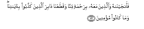 72. Faanjaynahu waallatheena maAAahu birahmatin minna waqataAAna dabira allatheena kaththaboo bi-ayatina wama kanoo mu/mineena