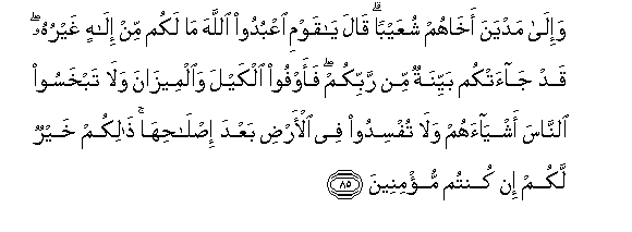 85. Wa-ila madyana akhahum shuAAayban qala ya qawmi oAAbudoo Allaha ma lakum min ilahin ghayruhu qad jaatkum bayyinatun min rabbikum faawfoo alkayla waalmeezana wala tabkhasoo alnnasa ashyaahum wala tufsidoo fee al-ardi baAAda islahiha thalikum khayrun lakum in kuntum mu/mineena