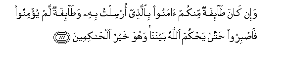 87. Wa-in kana ta-ifatun minkum amanoo biallathee orsiltu bihi wata-ifatun lam yu/minoo faisbiroo hatta yahkuma Allahu baynana wahuwa khayru alhakimeena