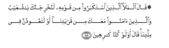 88. Qala almalao allatheena istakbaroo min qawmihi lanukhrijannaka ya shuAAaybu waallatheena amanoo maAAaka min qaryatina aw lataAAoodunna fee millatina qala awa law kunna kariheena