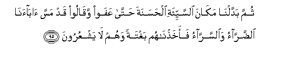 95. Thumma baddalna makana alssayyi-ati alhasanata hatta AAafaw waqaloo qad massa abaana alddarrao waalssarrao faakhathnahum baghtatan wahum la yashAAuroona