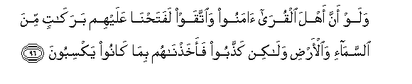 96. Walaw anna ahla alqura amanoo waittaqaw lafatahna AAalayhim barakatin mina alssama-i waal-ardi walakin kaththaboo faakhathnahum bima kanoo yaksiboona