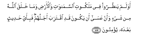 185. Awalam yanthuroo fee malakooti alssamawati waal-ardi wama khalaqa Allahu min shay-in waan AAasa an yakoona qadi iqtaraba ajaluhum fabi-ayyi hadeethin baAAdahu yu/minoona