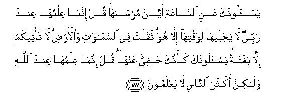 187. Yas-aloonaka AAani alssaAAati ayyana mursaha qul innama AAilmuha AAinda rabbee la yujalleeha liwaqtiha illa huwa thaqulat fee alssamawati waal-ardi la ta/teekum illa baghtatan yas-aloonaka kaannaka hafiyyun AAanha qul innama AAilmuha AAinda Allahi walakinna akthara alnnasi la yaAAlamoona