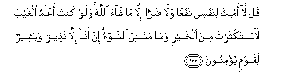 188. Qul la amliku linafsee nafAAan wala darran illa ma shaa Allahu walaw kuntu aAAlamu alghayba laistakthartu mina alkhayri wama massaniya alssoo-o in ana illa natheerun wabasheerun liqawmin yu/minoona
