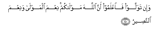 40. Wa-in tawallaw faiAAlamoo anna Allaha mawlakum niAAma almawla waniAAma alnnaseeru