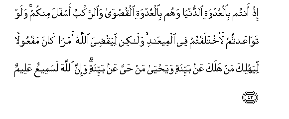 42. Ith antum bialAAudwati alddunya wahum bialAAudwati alquswa waalrrakbu asfala minkum walaw tawaAAadtum laikhtalaftum fee almeeAAadi walakin liyaqdiya Allahu amran kana mafAAoolan liyahlika man halaka AAan bayyinatin wayahya man hayya AAan bayyinatin wa-inna Allaha lasameeAAun AAaleemun