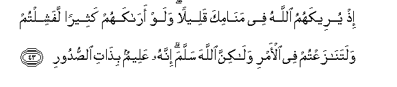 43. Ith yureekahumu Allahu fee manamika qaleelan walaw arakahum katheeran lafashiltum walatanazaAAtum fee al-amri walakinna Allaha sallama innahu AAaleemun bithati alssudoori