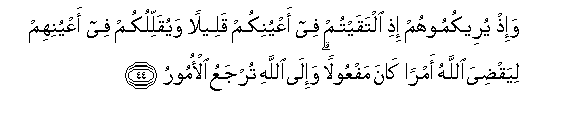 44. Wa-ith yureekumoohum ithi iltaqaytum fee aAAyunikum qaleelan wayuqallilukum fee aAAyunihim liyaqdiya Allahu amran kana mafAAoolan wa-ila Allahi turjaAAu al-omooru