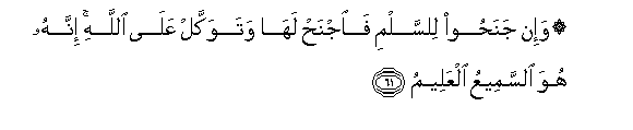 61. But if the enemy incline towards peace, do thou (also) incline towards peace, and trust in Allah. for He is One that heareth and knoweth (all things).