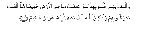 63. Waallafa bayna quloobihim law anfaqta ma fee al-ardi jameeAAan ma allafta bayna quloobihim walakinna Allaha allafa baynahum innahu AAazeezun hakeemun