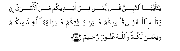 70. Ya ayyuha alnnabiyyu qul liman fee aydeekum mina al-asra in yaAAlami Allahu fee quloobikum khayran yu/tikum khayran mimma okhitha minkum wayaghfir lakum waAllahu ghafoorun raheemun