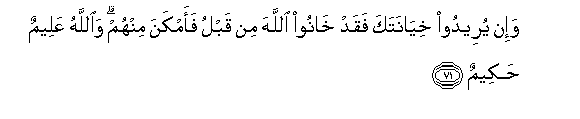 71. Wa-in yureedoo khiyanataka faqad khanoo Allaha min qablu faamkana minhum waAllahu AAaleemun hakeemun