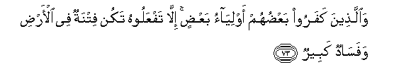 73. Waallatheena kafaroo baAAduhum awliyao baAAdin illa tafAAaloohu takun fitnatun fee al-ardi wafasadun kabeerun