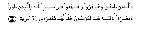 74. Waallatheena amanoo wahajaroo wajahadoo fee sabeeli Allahi waallatheena awaw wanasaroo ola-ika humu almu/minoona haqqan lahum maghfiratun warizqun kareemun