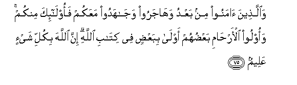 75. Waallatheena amanoo min baAAdu wahajaroo wajahadoo maAAakum faola-ika minkum waoloo al-arhami baAAduhum awla bibaAAdin fee kitabi Allahi inna Allaha bikulli shay-in AAaleemun