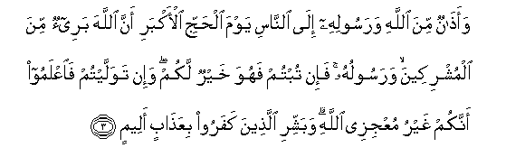 3. Waathanun mina Allahi warasoolihi ila alnnasi yawma alhajji al-akbari anna Allaha baree-on mina almushrikeena warasooluhu fa-in tubtum fahuwa khayrun lakum wa-in tawallaytum faiAAlamoo annakum ghayru muAAjizee Allahi wabashshiri allatheena kafaroo biAAathabin aleemin