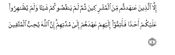 4. Illa allatheena AAahadtum mina almushrikeena thumma lam yanqusookum shay-an walam yuthahiroo AAalaykum ahadan faatimmoo ilayhim AAahdahum ila muddatihim inna Allaha yuhibbu almuttaqeena