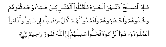 5. Fa-itha insalakha al-ashhuru alhurumu faoqtuloo almushrikeena haythu wajadtumoohum wakhuthoohum waohsuroohum waoqAAudoo lahum kulla marsadin fa-in taboo waaqamoo alssalata waatawoo alzzakata fakhalloo sabeelahum inna Allaha ghafoorun raheemun