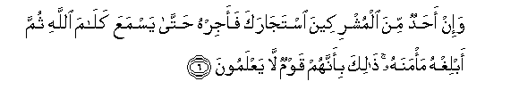 6. Wa-in ahadun mina almushrikeena istajaraka faajirhu hatta yasmaAAa kalama Allahi thumma ablighhu ma/manahu thalika bi-annahum qawmun la yaAAlamoona