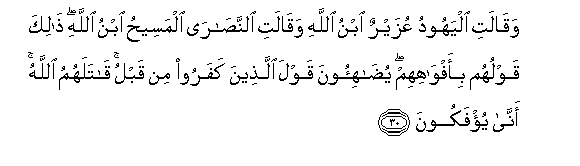 30. Waqalati alyahoodu AAuzayrun ibnu Allahi waqalati alnnasara almaseehu ibnu Allahi thalika qawluhum bi-afwahihim yudahi-oona qawla allatheena kafaroo min qablu qatalahumu Allahu anna yu/fakoona