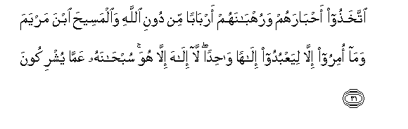 31. Ittakhathoo ahbarahum waruhbanahum arbaban min dooni Allahi waalmaseeha ibna maryama wama omiroo illa liyaAAbudoo ilahan wahidan la ilaha illa huwa subhanahu AAamma yushrikoona