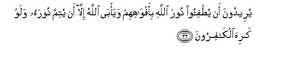 32. Yureedoona an yutfi-oo noora Allahi bi-afwahihim waya/ba Allahu illa an yutimma noorahu walaw kariha alkafiroona