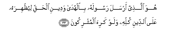 33. Huwa allathee arsala rasoolahu bialhuda wadeeni alhaqqi liyuthhirahu AAala alddeeni kullihi walaw kariha almushrikoona
