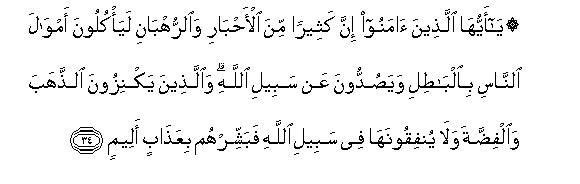 34. Ya ayyuha allatheena amanoo inna katheeran mina al-ahbari waalrruhbani laya/kuloona amwala alnnasi bialbatili wayasuddoona AAan sabeeli Allahi waallatheena yaknizoona alththahaba waalfiddata wala yunfiqoonaha fee sabeeli Allahi fabashshirhum biAAathabin aleemin