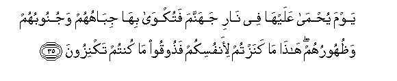 35. Yawma yuhma AAalayha fee nari jahannama fatukwa biha jibahuhum wajunoobuhum wathuhooruhum hatha ma kanaztum li-anfusikum fathooqoo ma kuntum taknizoona