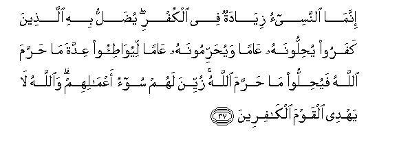 37. Innama alnnasee-o ziyadatun fee alkufri yudallu bihi allatheena kafaroo yuhilloonahu AAaman wayuharrimoonahu AAaman liyuwati-oo AAiddata ma harrama Allahu fayuhilloo ma harrama Allahu zuyyina lahum soo-o aAAmalihim waAllahu la yahdee alqawma alkafireena