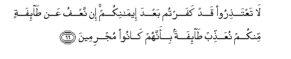 66. La taAAtathiroo qad kafartum baAAda eemanikum in naAAfu AAan ta-ifatin minkum nuAAaththib ta-ifatan bi-annahum kanoo mujrimeena