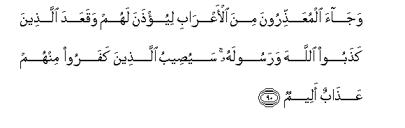 90. Wajaa almuAAaththiroona mina al-aAArabi liyu/thana lahum waqaAAada allatheena kathaboo Allaha warasoolahu sayuseebu allatheena kafaroo minhum AAathabun aleemun
