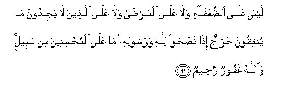91. Laysa AAala aldduAAafa-i wala AAala almarda wala AAala allatheena la yajidoona ma yunfiqoona harajun itha nasahoo lillahi warasoolihi ma AAala almuhsineena min sabeelin waAllahu ghafoorun raheemun