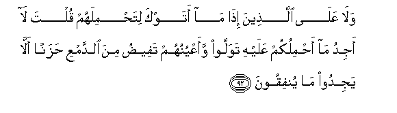 92. Wala AAala allatheena itha ma atawka litahmilahum qulta la ajidu ma ahmilukum AAalayhi tawallaw waaAAyunuhum tafeedu mina alddamAAi hazanan alla yajidoo ma yunfiqoona