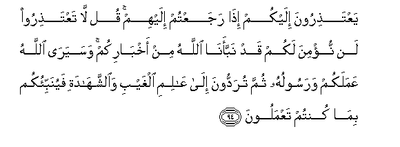 94. YaAAtathiroona ilaykum itha rajaAAtum ilayhim qul la taAAtathiroo lan nu/mina lakum qad nabbaana Allahu min akhbarikum wasayara Allahu AAamalakum warasooluhu thumma turaddoona ila AAalimi alghaybi waalshshahadati fayunabbi-okum bima kuntum taAAmaloona