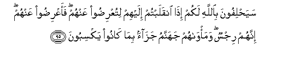 95. Sayahlifoona biAllahi lakum itha inqalabtum ilayhim lituAAridoo AAanhum faaAAridoo AAanhum innahum rijsun wama/wahum jahannamu jazaan bima kanoo yaksiboona