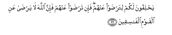 96. Yahlifoona lakum litardaw AAanhum fa-in tardaw AAanhum fa-inna Allaha la yarda AAani alqawmi alfasiqeena