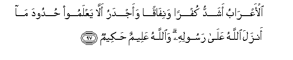 97. Al-aAArabu ashaddu kufran wanifaqan waajdaru alla yaAAlamoo hudooda ma anzala Allahu AAala rasoolihi waAllahu AAaleemun hakeemun