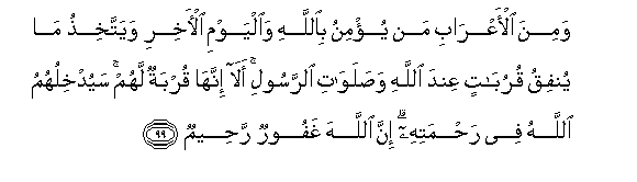 99. Wamina al-aAArabi man yu/minu biAllahi waalyawmi al-akhiri wayattakhithu ma yunfiqu qurubatin AAinda Allahi wasalawati alrrasooli ala innaha qurbatun lahum sayudkhiluhumu Allahu fee rahmatihi inna Allaha ghafoorun raheemun