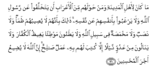 120. Ma kana li-ahli almadeenati waman hawlahum mina al-aAArabi an yatakhallafoo AAan rasooli Allahi wala yarghaboo bi-anfusihim AAan nafsihi thalika bi-annahum la yuseebuhum thamaon wala nasabun wala makhmasatun fee sabeeli Allahi wala yataoona mawti-an yagheethu alkuffara wala yanaloona min AAaduwwin naylan illa kutiba lahum bihi AAamalun salihun inna Allaha la yudeeAAu ajra almuhsineena