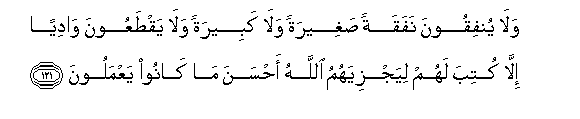 121. Wala yunfiqoona nafaqatan sagheeratan wala kabeeratan wala yaqtaAAoona wadiyan illa kutiba lahum liyajziyahumu Allahu ahsana ma kanoo yaAAmaloona