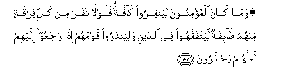 122. Wama kana almu/minoona liyanfiroo kaffatan falawla nafara min kulli firqatin minhum ta-ifatun liyatafaqqahoo fee alddeeni waliyunthiroo qawmahum itha rajaAAoo ilayhim laAAallahum yahtharoona