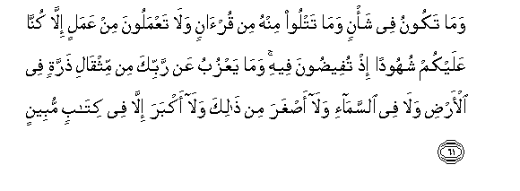 61. Wama takoonu fee sha/nin wama tatloo minhu min qur-anin wala taAAmaloona min AAamalin illa kunna AAalaykum shuhoodan ith tufeedoona feehi wama yaAAzubu AAan rabbika min mithqali tharratin fee al-ardi wala fee alssama-i wala asghara min thalika wala akbara illa fee kitabin mubeenun